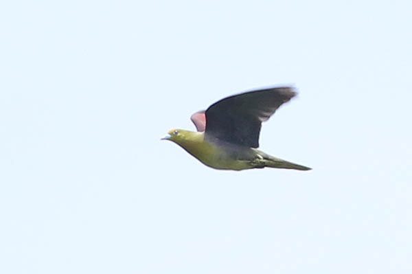 またこれらの鳥とは別に、飛び上がりの初速も速く、風に乗って速く飛ぶことができる鳥もいます。それはハトの仲間です。初列風切の湾曲の度合いは小さいのですが、鳩胸と言われるほど分厚い胸筋で力強い羽ばたきを可能にし、湾曲度合いが小さい初列風切でも素早い飛び立ちを可能にしています(写真4)。以前奄美大島で、林道沿いでイチゴ類の実を食べていたズアカアオバト(写真5)が車に驚いて飛び立ち、車を先導するように飛びましたが、スピードは一気にトップスピードになり、40km/hを超えていました。力強い羽ばたきとスピードには驚かされました。このほかスズメ目など中間型のタイプも両方の利点を併せ持つと言えるかもしれません。