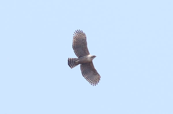 次列風切の長さ、数の組み合わせは多様で、それぞれに理由があります。全てを説明することはできませんが、翼の形と生活スタイルの違いについて猛禽類を例にとって比較してみましょう。猛禽類の中でもタカ目タカ科の翼の形状は色々で、開けた環境で狩りをするチュウヒやイヌワシ(写真8)は比較的細長い翼を、森林性で林内移動が多いクマタカは次列風切が長く、幅広の翼をしています(写真9)。開けた空間で狩りをするにはイヌワシのような翼が、林内を飛翔するにはクマタカのような翼が適しているようです。同じ猛禽類でハヤブサ目ハヤブサ科のハヤブサは、次列風切が短く、細長い翼をしています。これは上空で風に乗った速い飛翔を可能にしており、そのスピードを生かして狩りをするわけです。