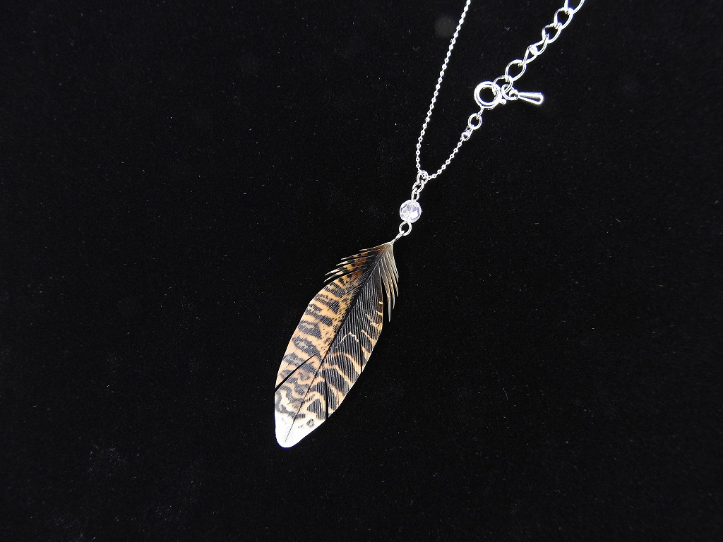 粘土の羽根飾りは職人が一枚一枚丹誠込めて創り上げた、アマミヤマシギ(尾羽)の樹脂粘土製ネックレスです。チェーンタイプと革紐タイプの2種類があります。本物とは違い、柔軟な素材ですので曲がっても元に戻せます。