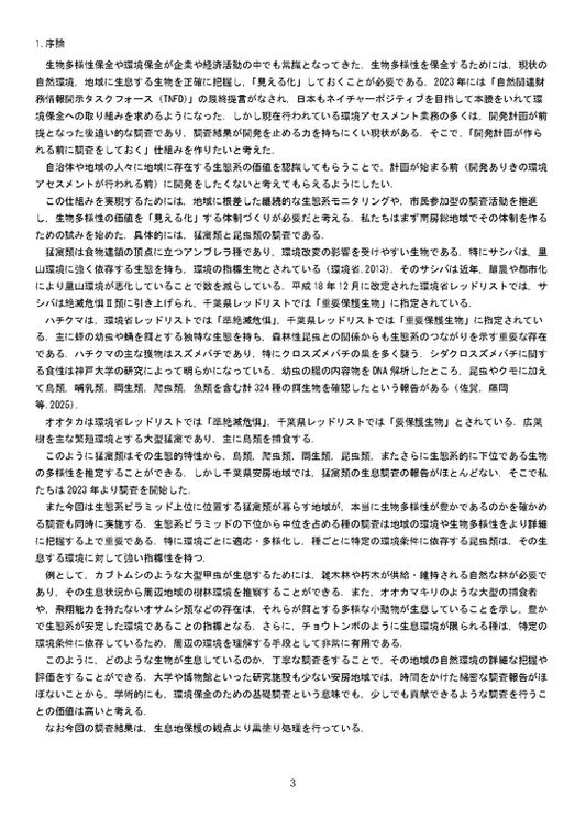 この調査は始めてから3年目となった。しかし、今後も継続した調査を続けることが必要である。また、生物多様性を証明するためには猛禽類、昆虫だけでなく、脊椎動物や水性生物、植物などの調査が必要である。さらに、グリーンカーボンクレジットとしての認定を受けるためには、森林整備活動も計画的に行う必要がある。