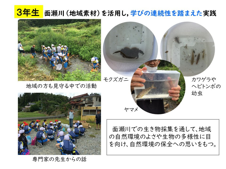 児童は、多くの水生生物が生息している面瀬川において、生き物を採取・観察し、水辺環境の課題解決に取り組んでいる。さらに、それらを基に「山と川のつながり」「川と海のつながり」など、河川学習から海洋学習へと発展させ、よりグローバルな視点での地域環境学習を展開している。